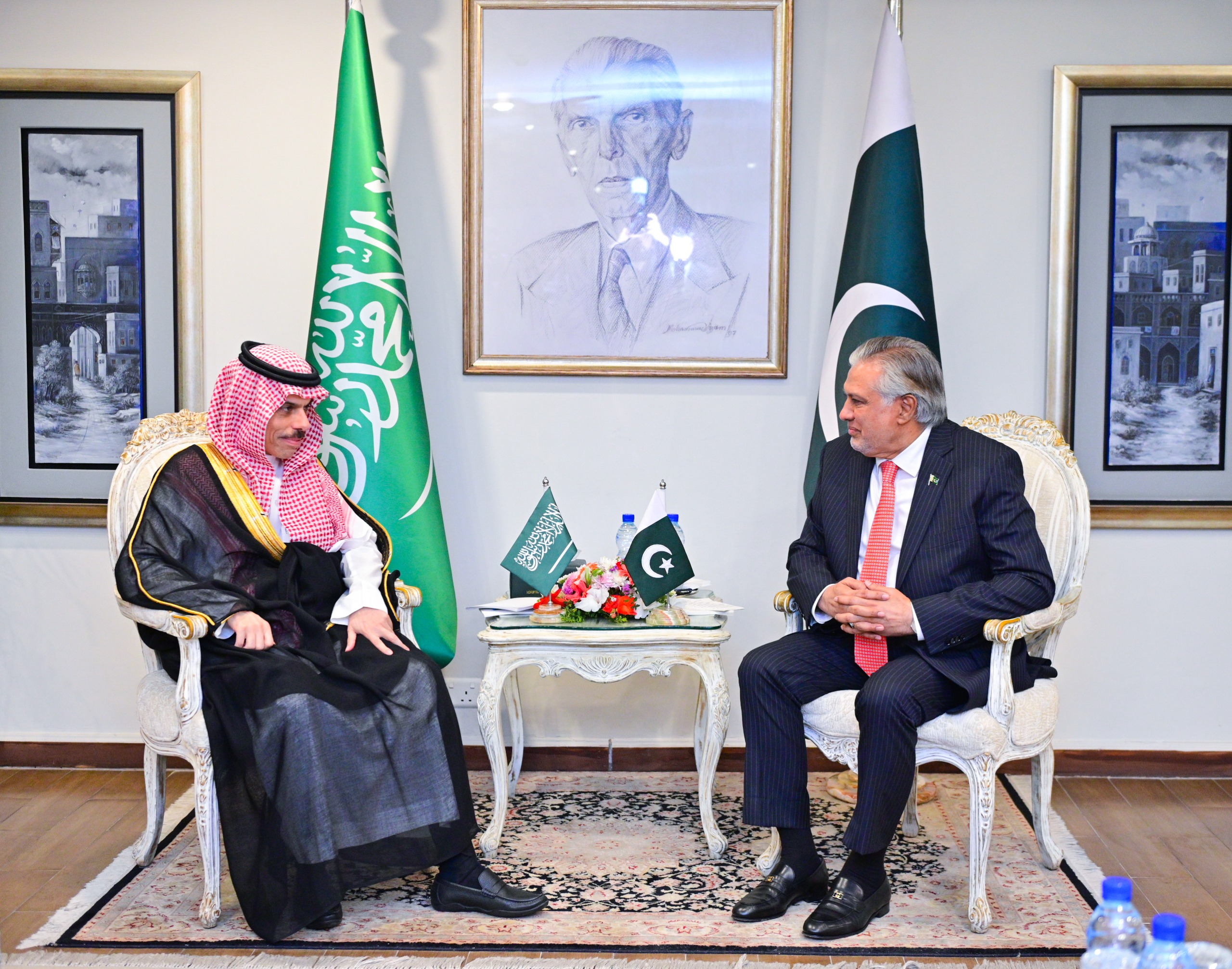 Foreign Minister Mohammad Ishaq Dar received Saudi Foreign Minister Prince Faisal bin Farhan Al Saud at the Ministry of Foreign Affairs on 16 April.